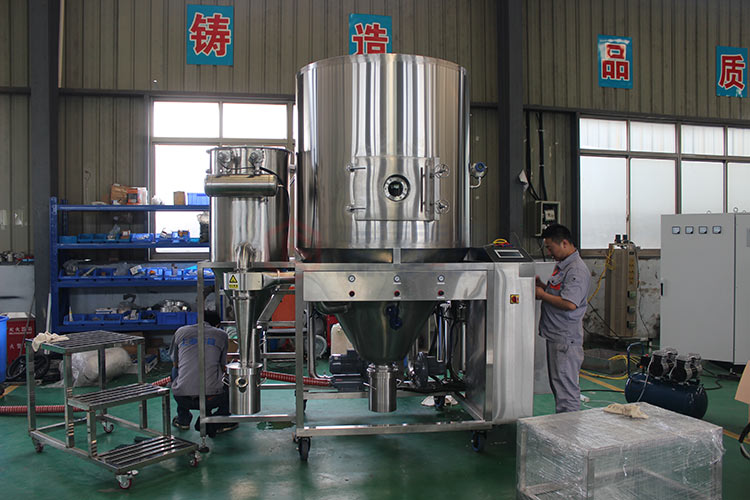 空氣經(jīng)過濾和加熱,進入干燥器頂部空氣分配器,熱空氣呈螺旋狀均勻地進入干燥室。料液經(jīng)塔體頂部的高速離心霧化器,(旋轉(zhuǎn))噴霧成極細微的霧狀液珠,與熱空氣并流接觸在極短的時間內(nèi)可干燥為成品。成品連續(xù)地由干燥塔底部和旋風(fēng)分離器中輸出,廢氣由引風(fēng)機排空。